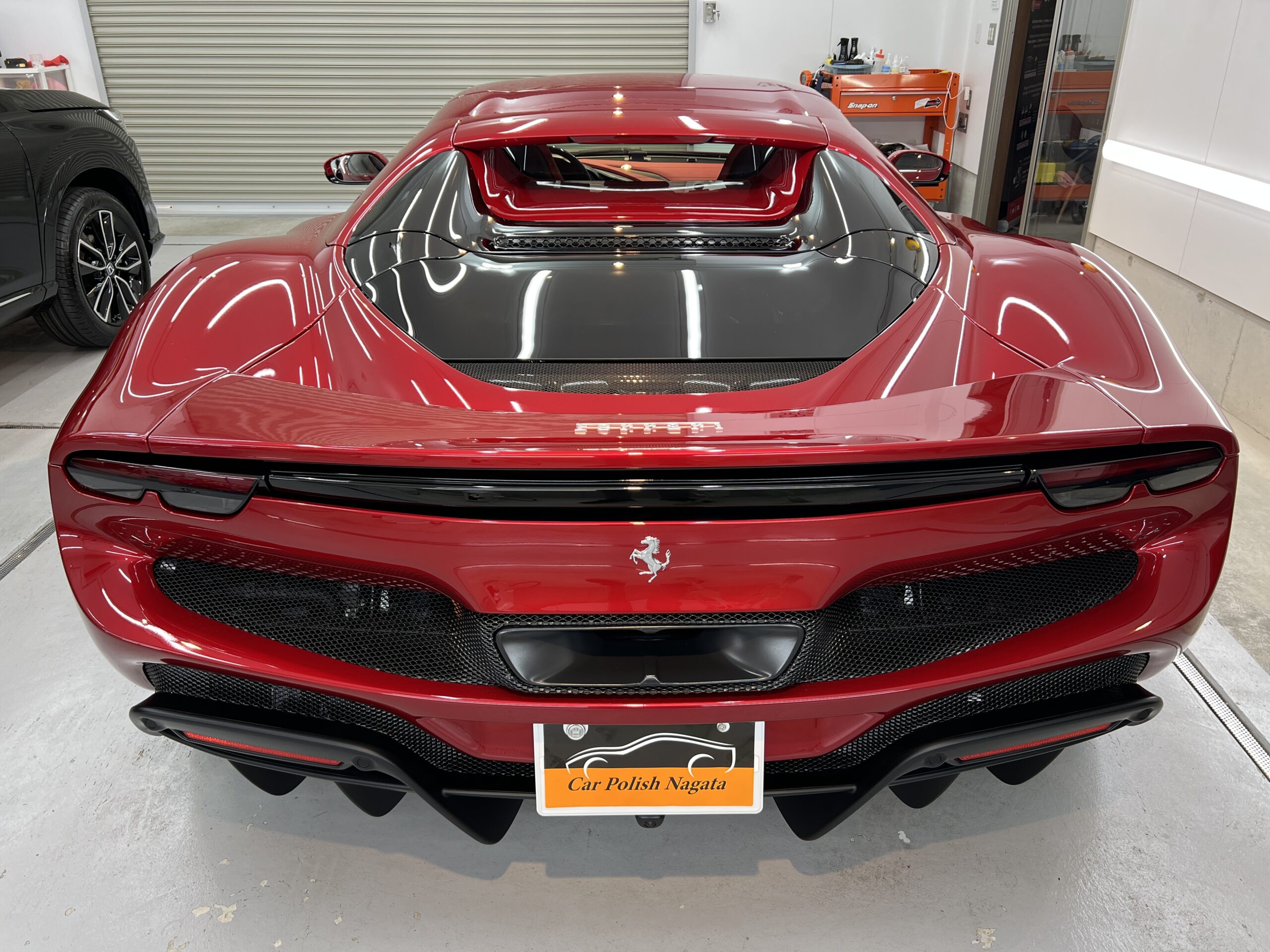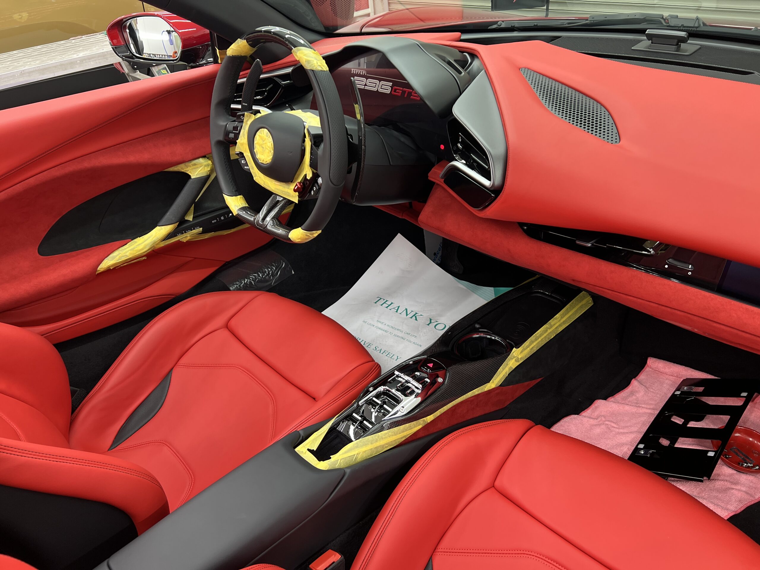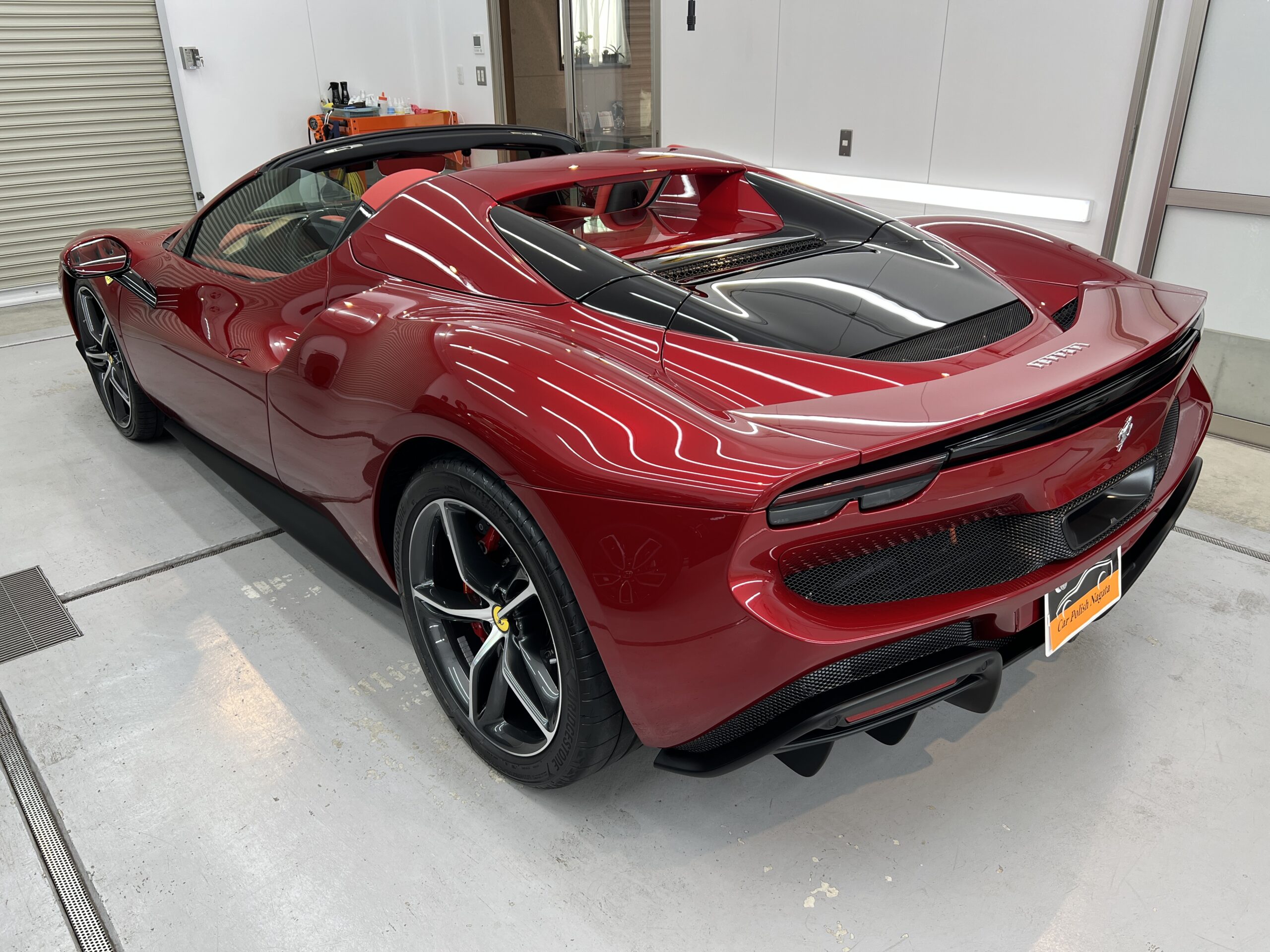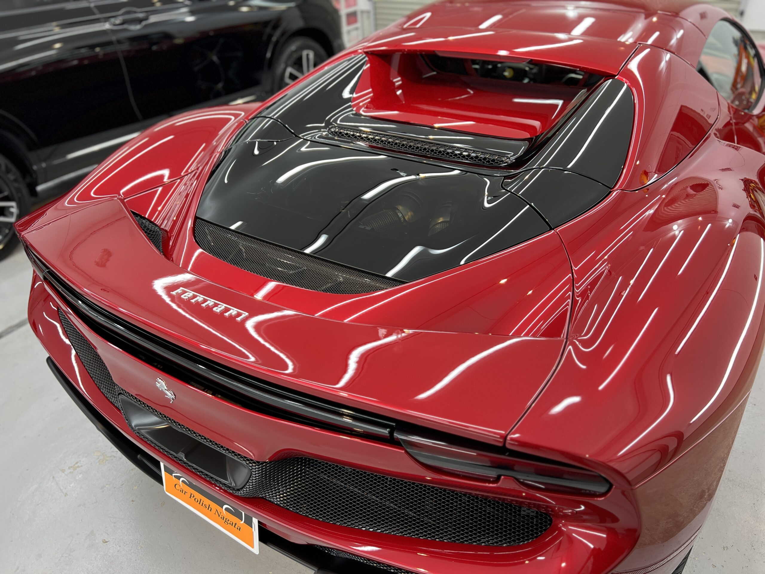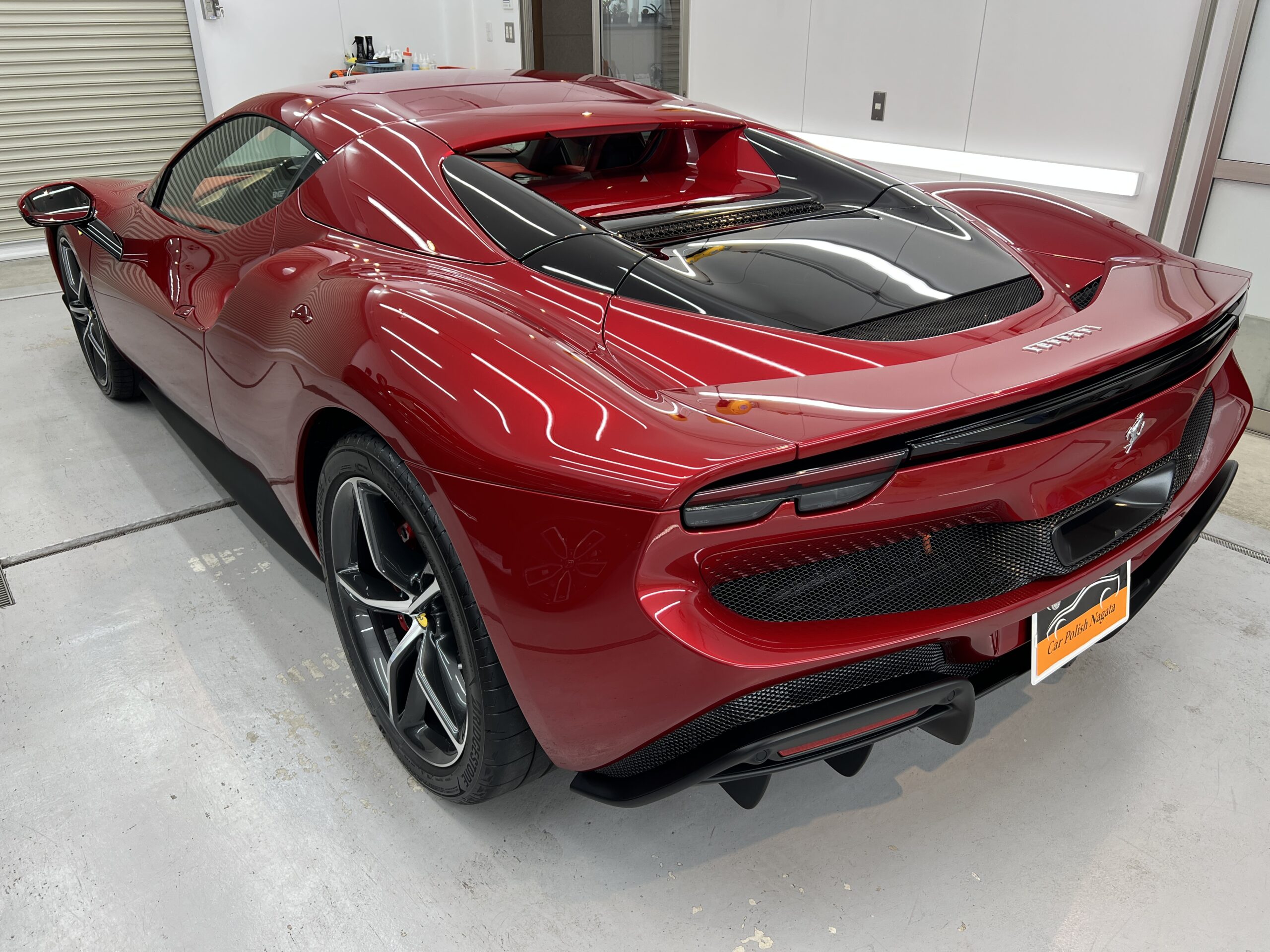 お預かりした296GTSはロッソイモラというボディーカラーで、通常のロッソコルサと比べ赤みを落とし、パールが入ることで深みのある綺麗なカラーです🔴