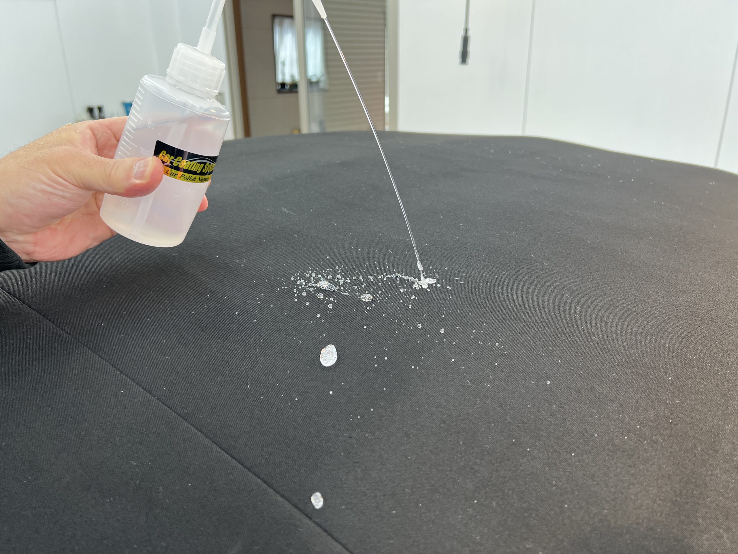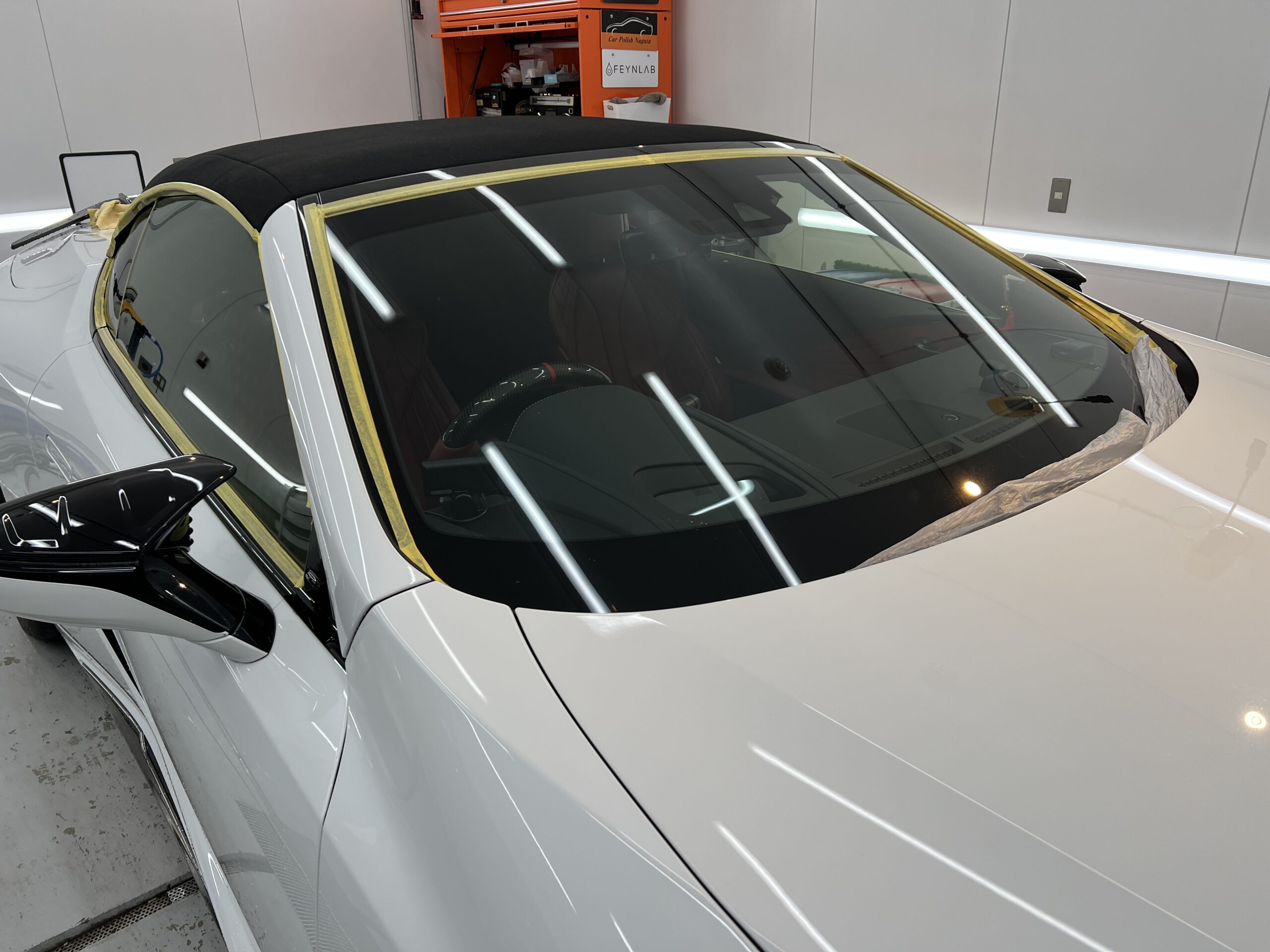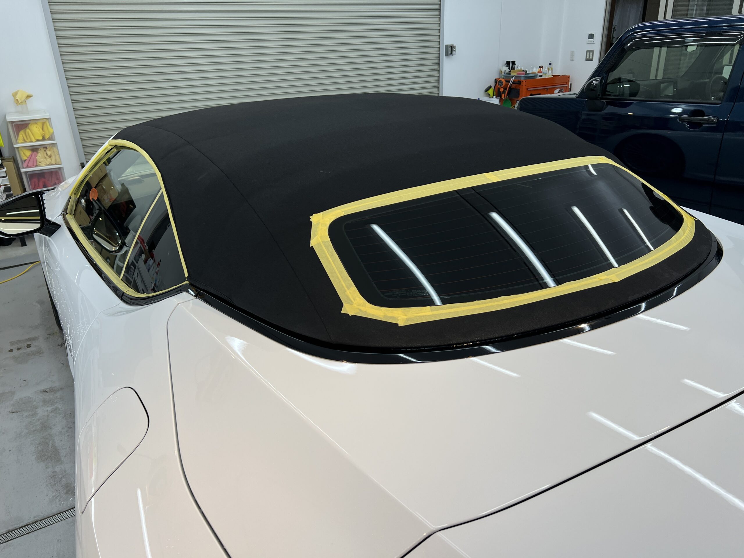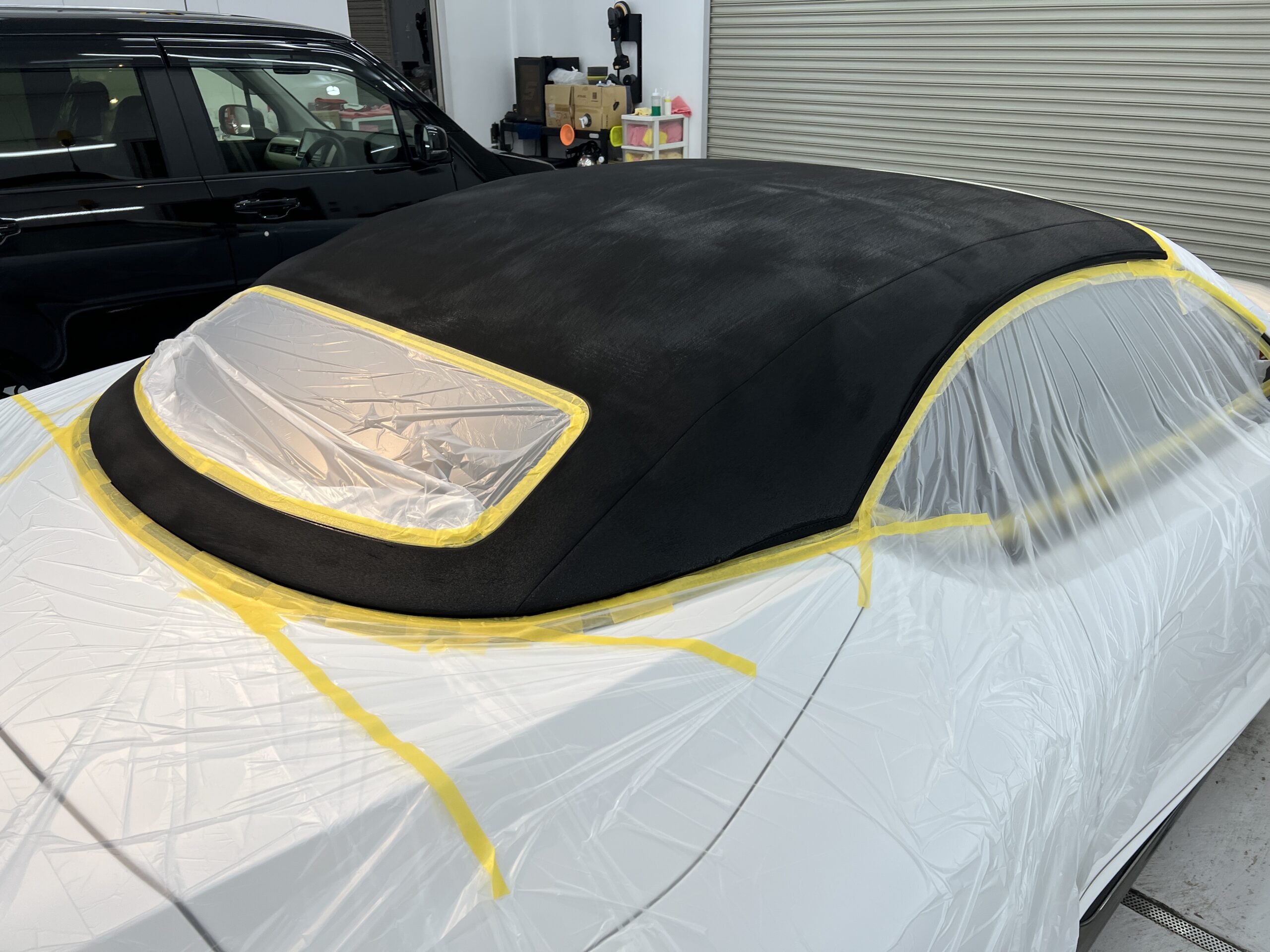 幌洗浄&乾燥後、養生をしっかり行い、幌専用のコーティング剤を施工していきます!